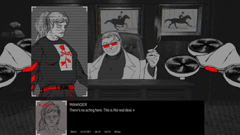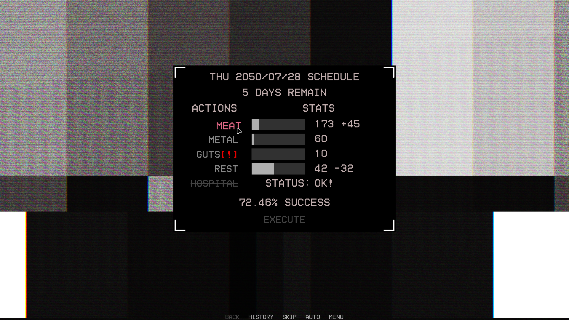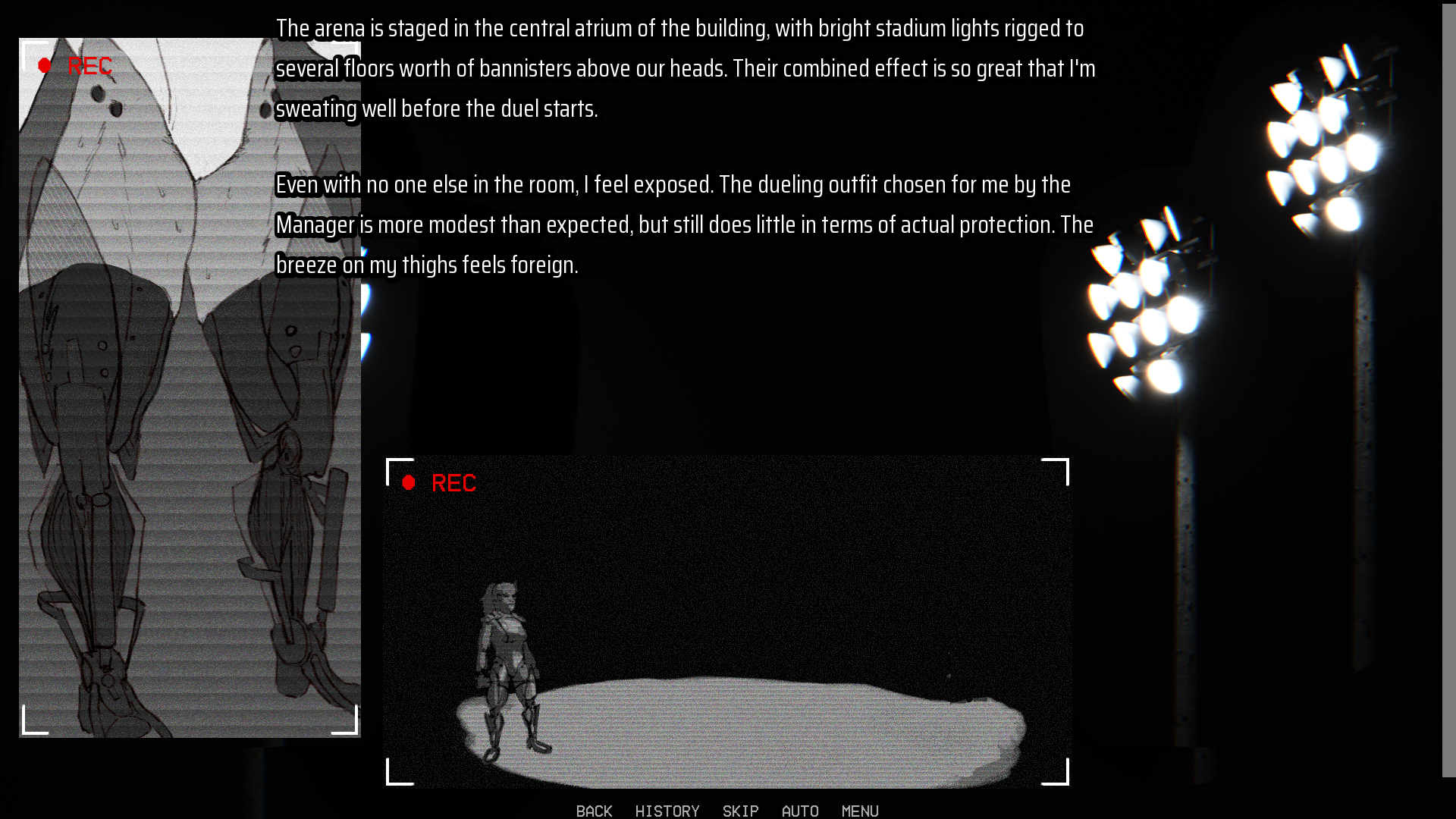 I'm really excited to see more of this. The manager's so fun with her huge ass grin and shiny red glasses and retro aug fetish. The battle sim is cool and I actually managed to do so bad on one run that I stepped into the ring and immediately fell to the floor and bled out. I couldn't stop laughing. Can't wait to see how this story goes!!